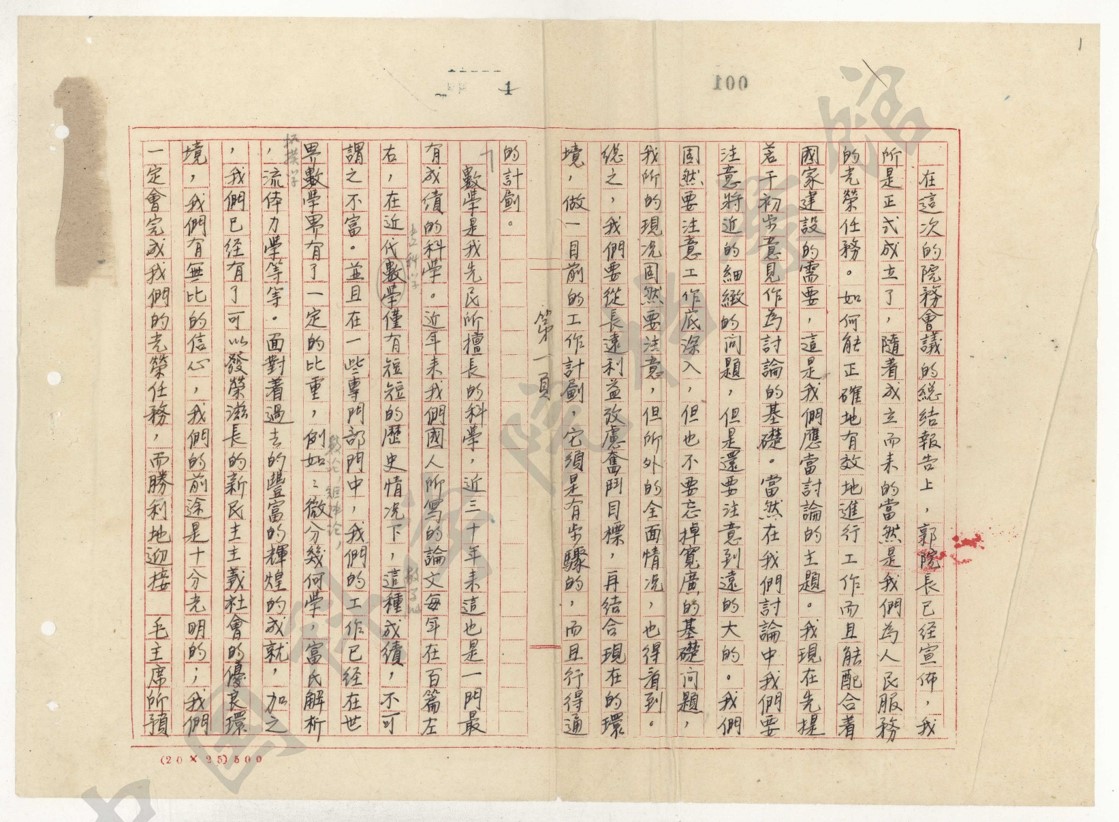 (华罗庚先生在1952年所写的工作计划,“数学是我先民所擅长的科学”)