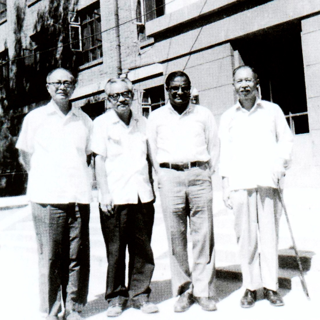 (难得的合影。20世界80年代初,系统所原办公楼,现融科大厦。左起:许国志、吴文俊、印度学者、关肇直。)