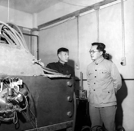 学部委员王淦昌(右)与丁大钊(左)在联合原子核研究所实验室工作
