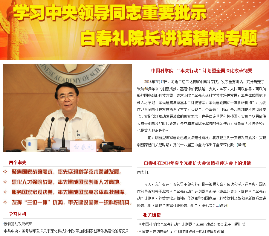 “率先行动”计划暨全面深化改革纲要》和中央领导同志重要批示、白春礼院长讲话精神。