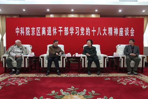 孙建国在总结讲话中指出,将按照中央和院党组的部署和要求,组织全院老同志认真学习贯彻党的十八大精神。我们将请方新同志为全院离退休老同志作学习十八大精神的辅导报告。通过多种形式的宣传和学习,使离退休老同志深刻领会党的十八大提出的一系列新思想、新观点、新目标、新举措,使广大离退休干部的思想统一到十八大精神上来,力量凝聚到十八提出的目标和任务上来,更加关心和支持党和国家的事业发展,更加关心和支持中科院的创新发展,为“创新2020”全面成功实施,实现中科院科技创新跨越,为全面建成小康社会和建设美丽中国提供强力科技支撑做出应有的贡献。