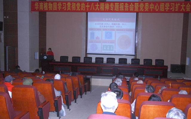 11月26日,中科院华南植物园举行学习贯彻党的十八大精神专题报告会暨党委中心组学习扩大会。党的十八大代表、广东省微生物研究所研究员、华南植物园2005届博士毕业生许玫英作了题为《中国共产党第十八次全国代表大会会议精神及参会感受》的专题报告。园领导任海、魏平,党委委员邢福武、夏汉平、范德权,各部门负责同志、党支部支委,及部分党员、职工130余人参加报告会,黄宏文主任、傅声雷副主任、周国逸委员因公请假并自学了许玫英的报告。