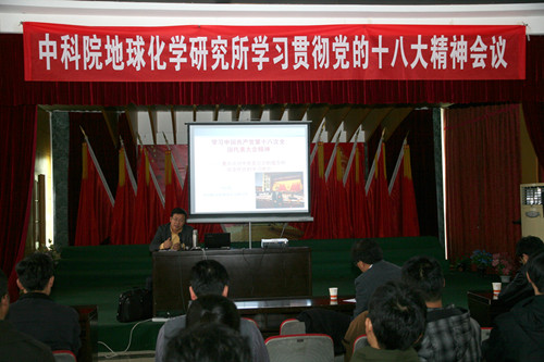 院士刘丛强专程从北京到中科院地球化学研究所作精彩报告,与地球化学研究所全体党员干部一同学习贯彻宣传党的十八大精神,地化所所长胡瑞忠主持会议。