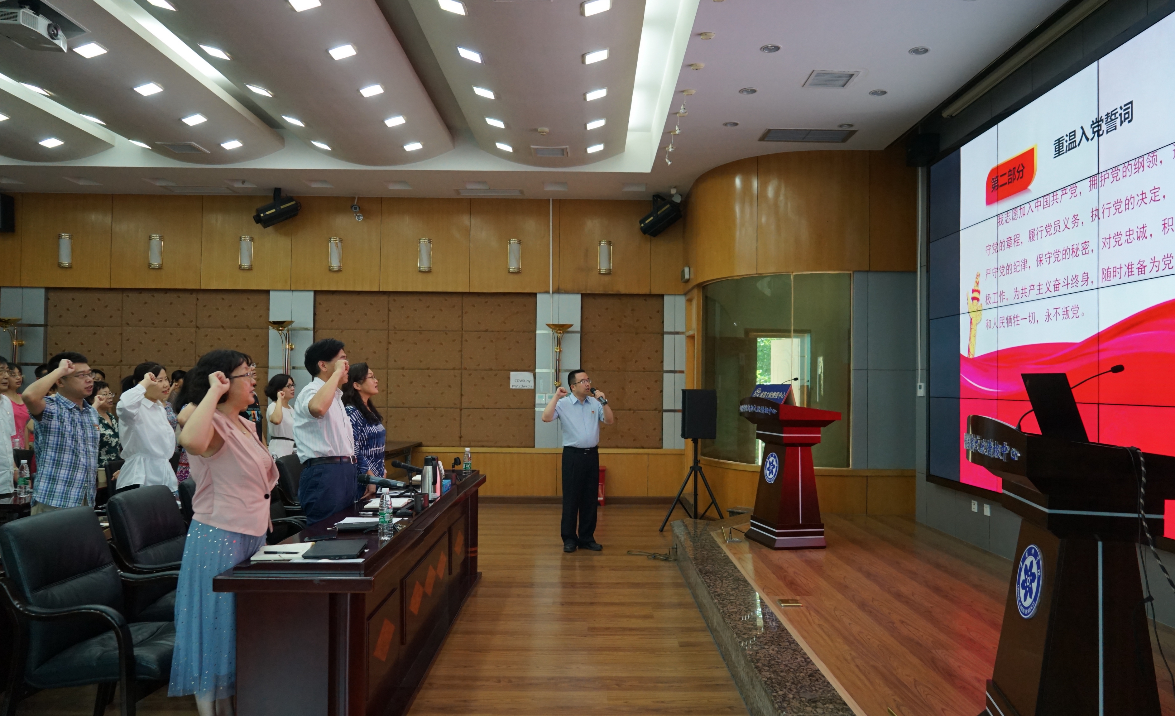 成都文献情报中心组织庆祝建党98周年暨“不忘初心、牢记使命”专题报告会。中心领导班子、中层干部、全体在职党员、离退休党员代表、研究生党员代表参加活动,会议由纪委书记房俊民主持。