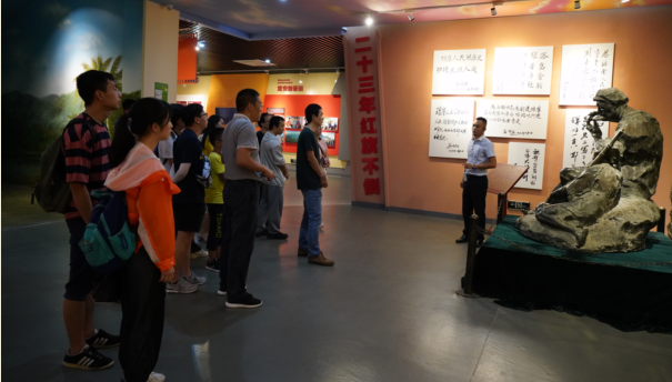 在母瑞山革命根据地纪念园,讲解员带领大家在王文明和冯白驹的塑像下缅怀先烈,开展了重温入党誓词活动;跟随革命先烈足迹,参观了琼崖革命历史展,并听取了老馆长关于母瑞山革命历程的专题党课。随后,大家前往琼海椰子寨,参观了琼崖革命武装斗争第一枪纪念碑及纪念馆,在讲解员的带领下深入了解椰子寨战斗打响琼崖武装斗争第一枪的惊心动魄的历史。