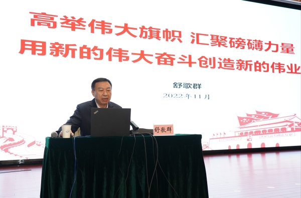 党的二十大代表、中科院党的二十大精神宣讲团成员、中国科学技术大学党委书记舒歌群以《高举伟大旗帜汇聚磅礴力量 用新的伟大奋斗创造新的伟业》为题,从学习宣传贯彻党的二十大的重大意义、党的二十大的主题、过去五年工作和新时代十年伟大变革、马克思主义中国化时代化新境界、新时代新征程中国共产党的使命任务、全面建设社会主义现代化国家目标任务、坚持党的全面领导以及全面从严治党重大部署等七个部分,阐述了党的二十大的丰富内涵和精髓要义,分享了现场参加大会的体会,着重阐释了党的二十大对教育、科技和人才工作进行一体化部署的深刻内涵和重要价值。