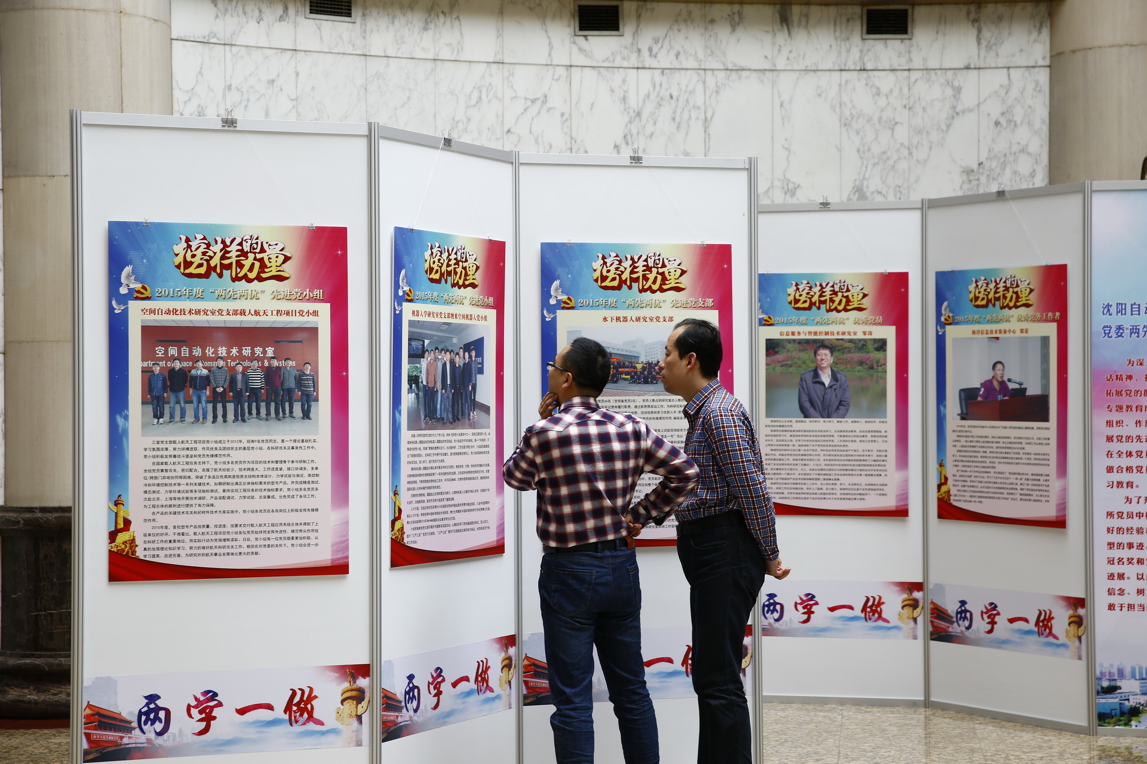 根据党中央4月6日“两学一做”学习教育工作座谈会“把合格的标尺立起来,把党员的先锋形象树起来,用行动体现信仰信念的力量”精神,沈阳自动化所举行了“创新2020”冠名奖和党委“两先两优”表彰集体和个人事迹展,号召全所人员向先进典型看齐。党办制作了立体展板在全所展出,以此在广大党员、职工中营造坚定理想信念、树立和落实新发展理念、带头攻坚克难敢于担当的良好氛围。