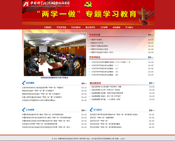 所网站开设了“两学一做”专栏,并放置在网站醒目位置。专栏内容丰富翔实,为党员进一步深入学习“两学一做”提供便捷渠道。党员可以通过专栏查看党章党规具体内容,与习近平系列讲话特别是其关于科技创新的论述内容,以及“两学一做”学习教育实施方案与相关通知;专栏及时更新研究所与各支部“两学一做”学习动态新闻;提供“两学一做”相关知识内容与评论文章供党员延伸学习;推出“身边榜样”与“全国楷模”事迹为党员树立学习榜样。