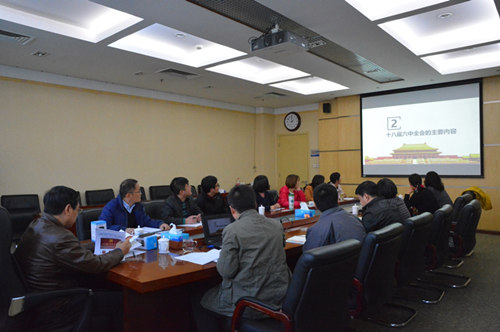 北京分院第四党支部召开支部会议,传达学习十八届六中全会会议精神。院党组成员、京区党委书记、分党组书记、北京分院院长何岩以普通党员身份参加会议,并为支部全体党员作十八届六中全会精神学习辅导报告。会议由支部书记王健主持。