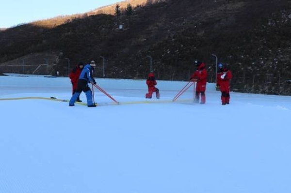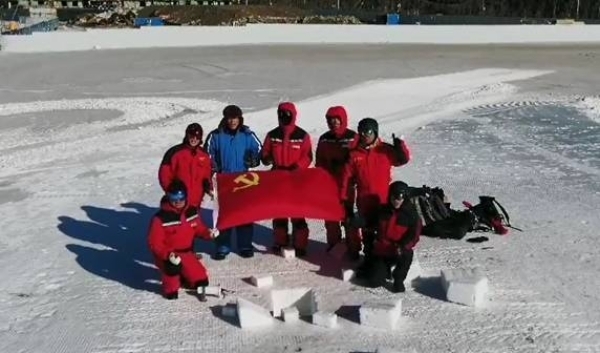 西北院施雅风冰冻圈科研攻关突击队团队成员在北京冬奥会雪务关键技术攻关中成立了临时支部,该图为2020年春节期间部分队员在冬奥会张家口云顶滑雪场开展了为期一个月的雪务观测。资料图