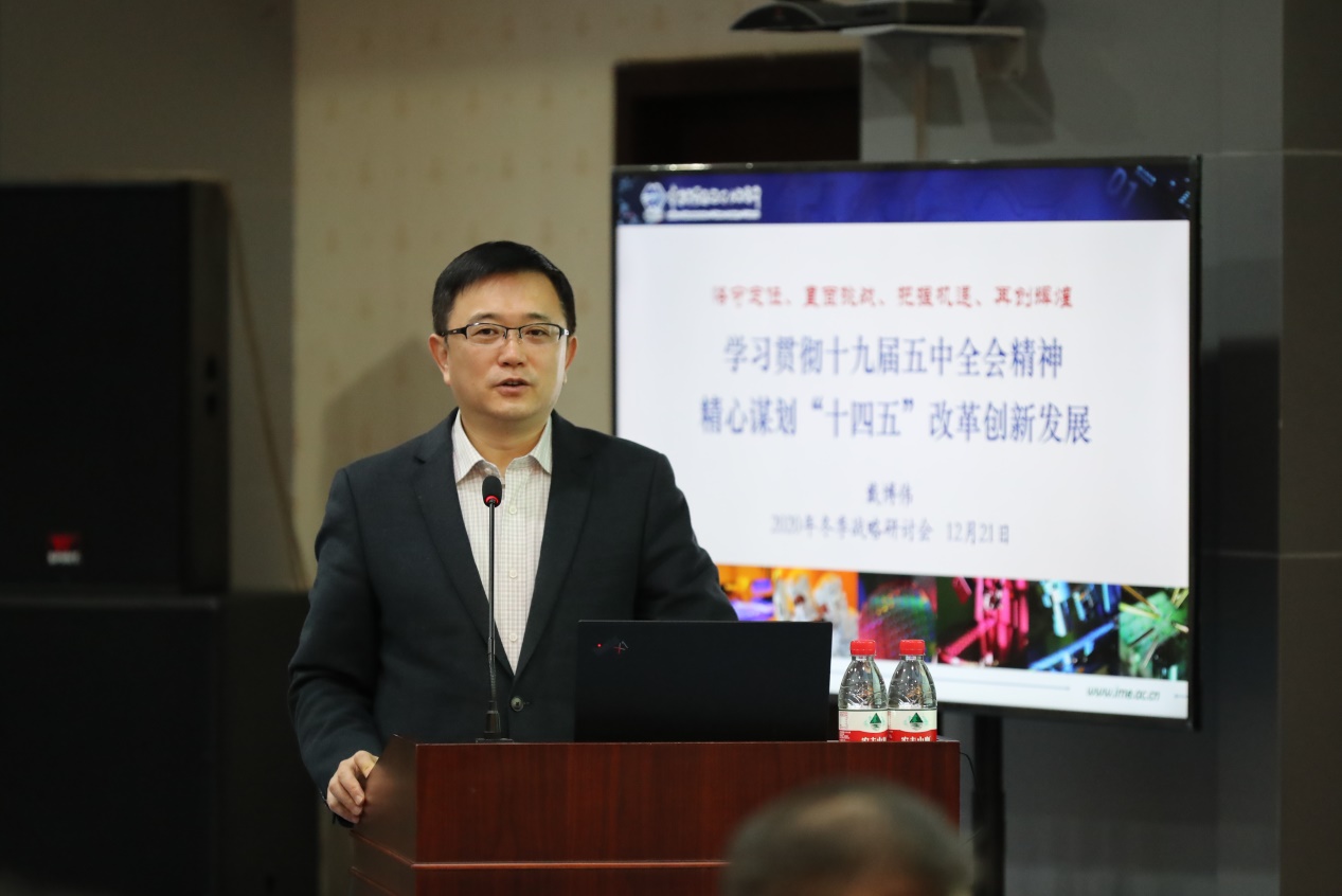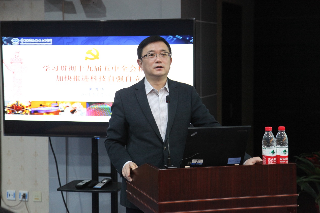 戴博伟在报告中简要介绍了全会的基本情况、重要成果、重大意义和规划《建议》的概况,介绍了“十四五”时期我国发展必须遵循的五个重要原则,重点解读了规划《建议》中关于科技创新的内容,指出,坚持创新在现代化建设全局中的核心地位,把科技自立自强作为国家发展战略支撑、摆在各项规划任务的首位进行专章部署,这是我们党编制五年规划建议历史上的第一次,也是以习近平同志为核心的党中央把握世界发展大势、立足当前、着眼长远作出的战略布局。他从“强化国家战略科技力量”等六个方面,对规划《建议》关于科技创新的新提法进行了逐一阐释,深入解读了规划《建议》关于科技创新的新部署、新要求,结合微电子所2020年冬季战略研讨会精神,通报了研究所落实中央精神和院党组决策部署,做好“十四五”时期“一三五”规划的工作思路、工作步骤和下一步工作重点。他要求,全所各级党组织要开展各类宣教活动,组织深入学习党的十九届五中全会精神;党员领导干部要发挥好表率作用,先学一步、学深一些,切实把学习成果转化为推动工作的实际能力。他号召全所党员群众进一步统一思想、形成共识、汇聚力量,在所党政领导班子的带领下,全力做好“十四五”开局工作,推动研究所发展再上一个新台阶,以优异成绩迎接建党一百周年。