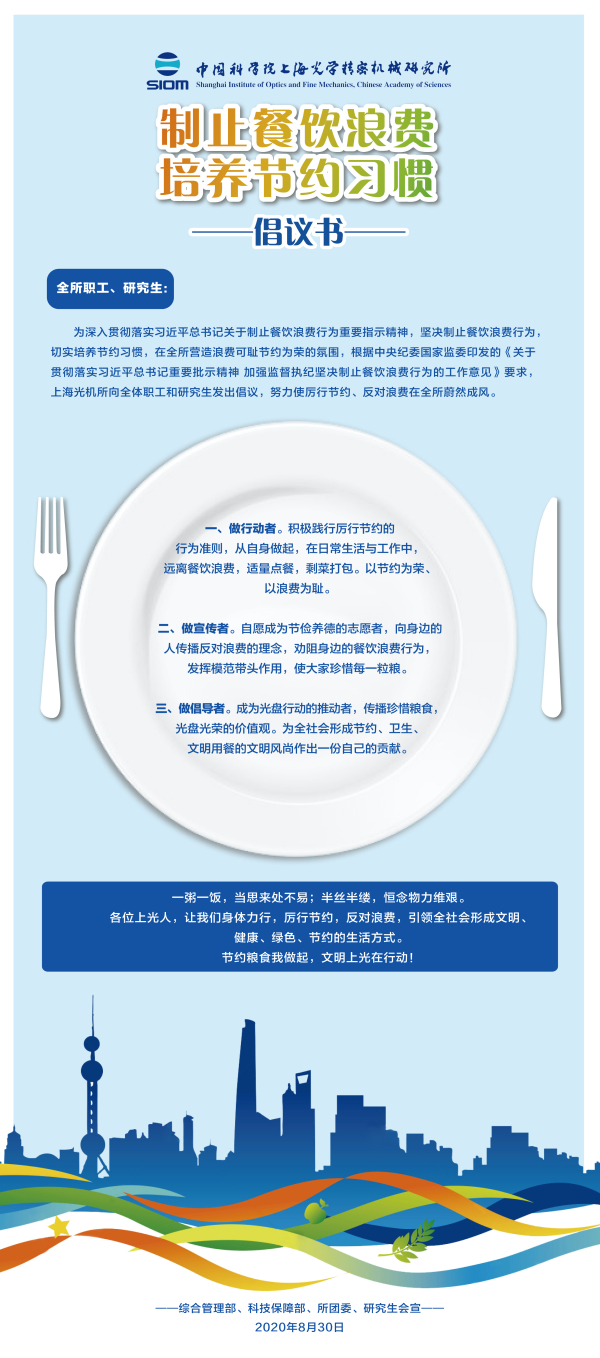 上海光机所通过邮件和官微,第一时间发出倡议,号召大家做节约粮食的行动者、宣传者、倡导者,从思想上牢固树立节约意识。