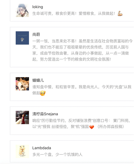 向全体职工、研究生征集“厉行勤俭节约,反对铺张浪费”的口号,积极做节约粮食的倡导者。许多老师同学们在官方公众号内留言,说出了自己关于餐饮浪费行为的看法和节约粮食创意口号。