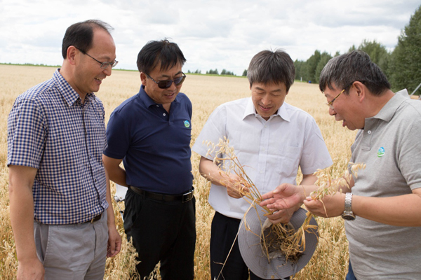 7月26日,呼伦贝尔农垦集团谢尔塔拉农场生态草牧业试验区的一处人工草地,中科院植物所所长、院士方精云(左三)在和专家交流高产燕麦的试种成果。新华社记者 金立旺 摄
