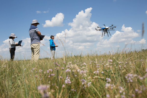 的科研人员正在用无人机监测草场恢复情况。新华社记者 金立旺 摄