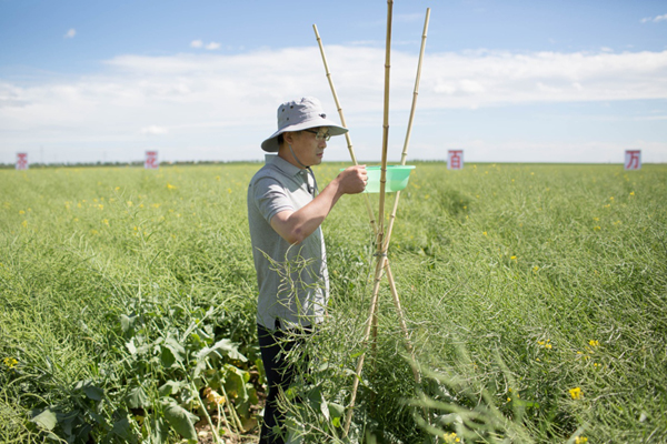 7月26日,在呼伦贝尔农垦集团谢尔塔拉农场生态草牧业试验区一处油菜种植试验地里,中科院动物所秦启联研究员在查看利用性诱剂诱惑害虫的盆子,通过这种方式可以判断害虫是否处于高峰期,从而决定投放赤眼蜂虫卵的时间。新华社记者 金立旺 摄